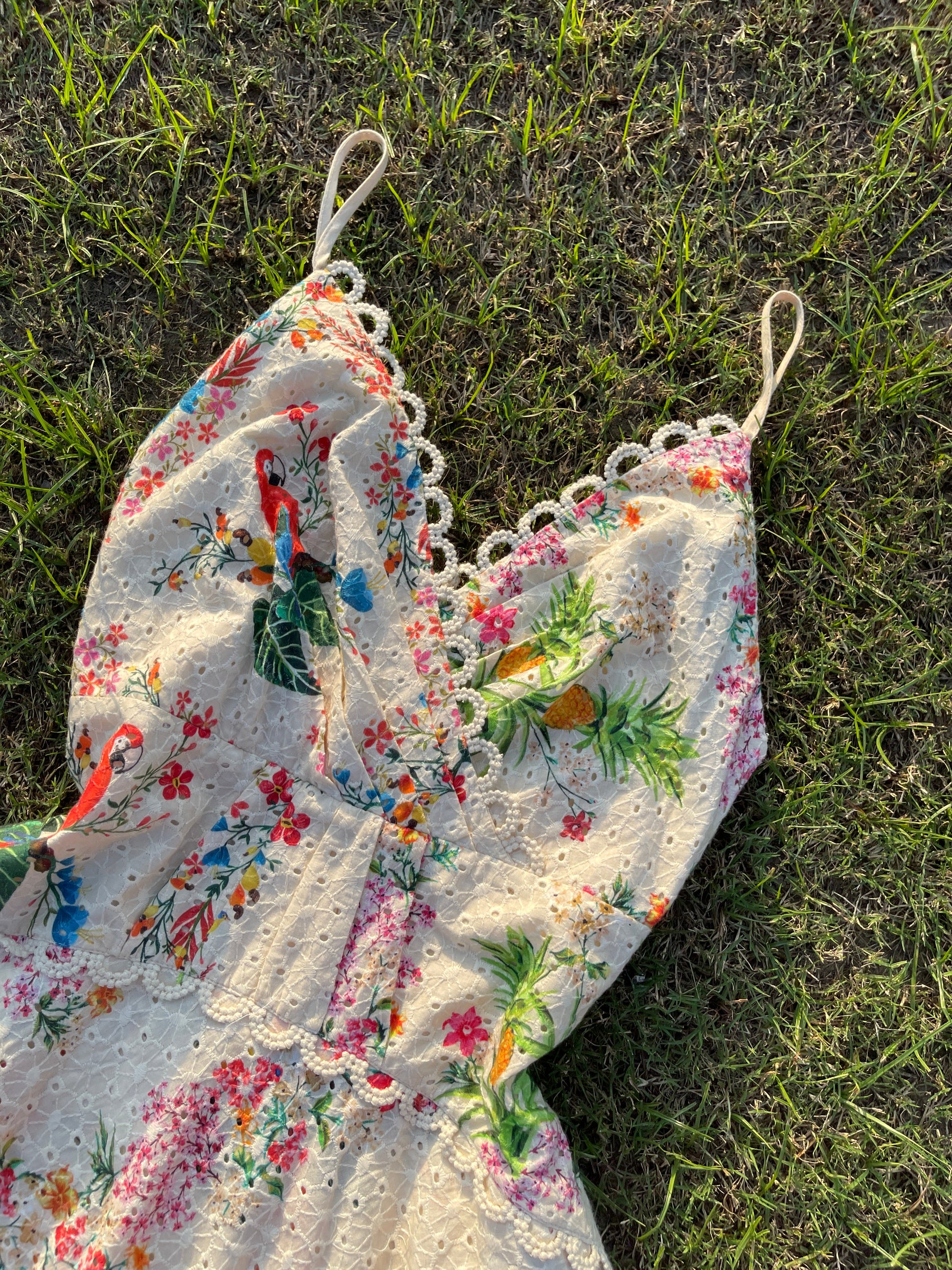 🌸 Color: Ivory cream base with multicolor floral vines & tropical bird motifs ✨ Details: Spaghetti straps with delicate scalloped lace trim