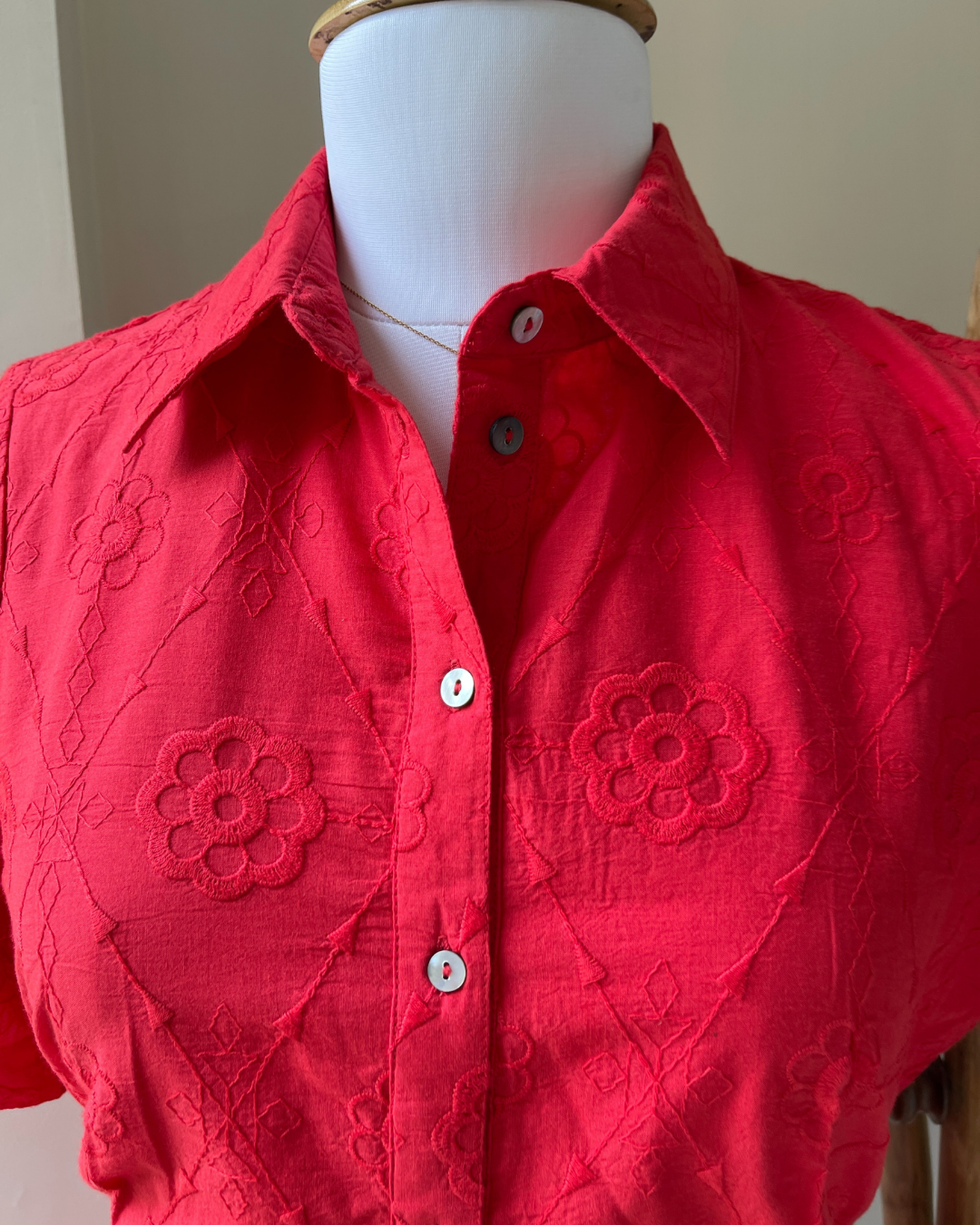 ✨ Details: Feminine cotton mini dress featuring delicate floral embroidery throughout. Designed as a classic button-down shirt dress with a pointed collar, short sleeves, and a neatly tailored waist seam. Finished with contrast buttons and a scalloped embroidered hem for a soft, handcrafted feel.