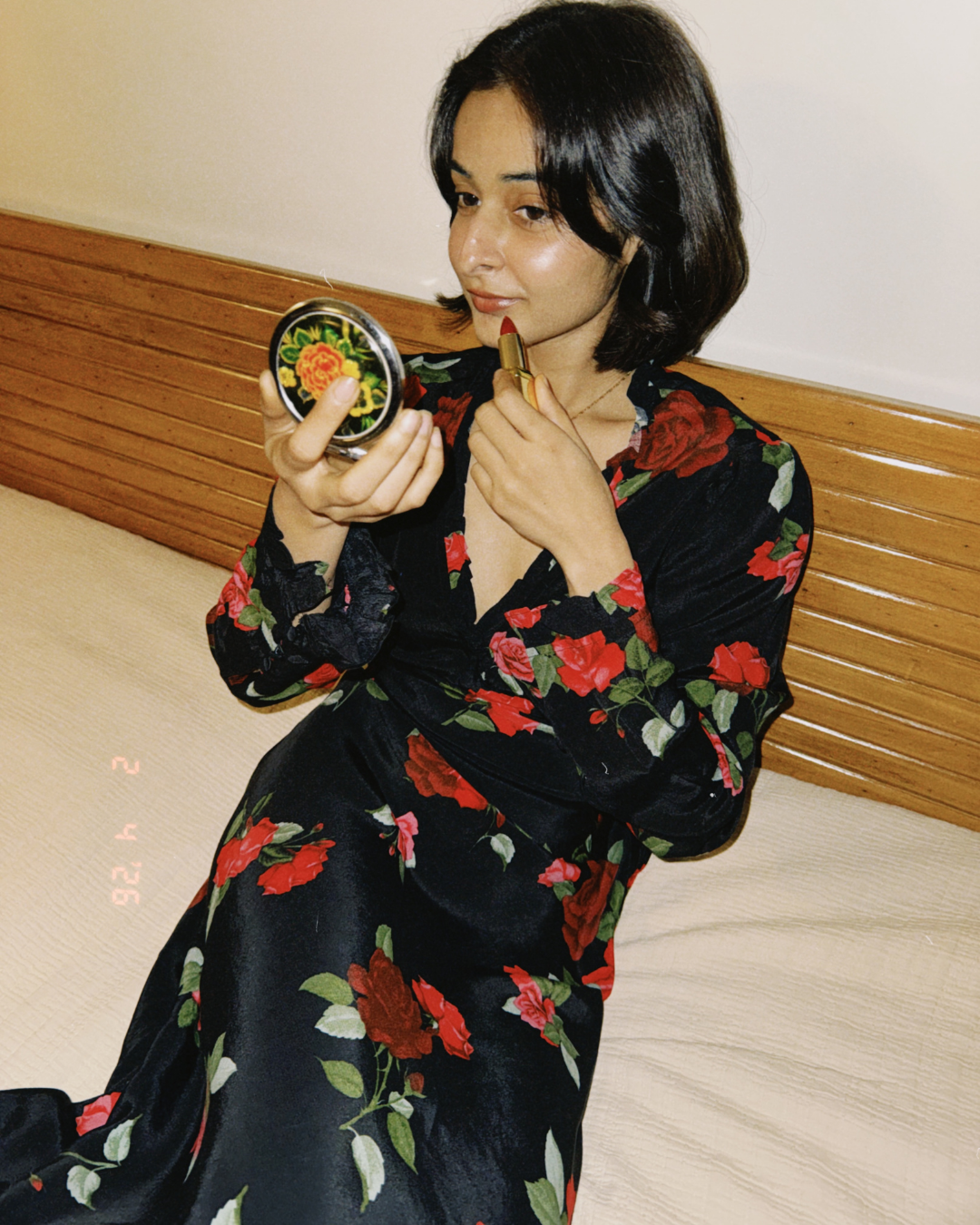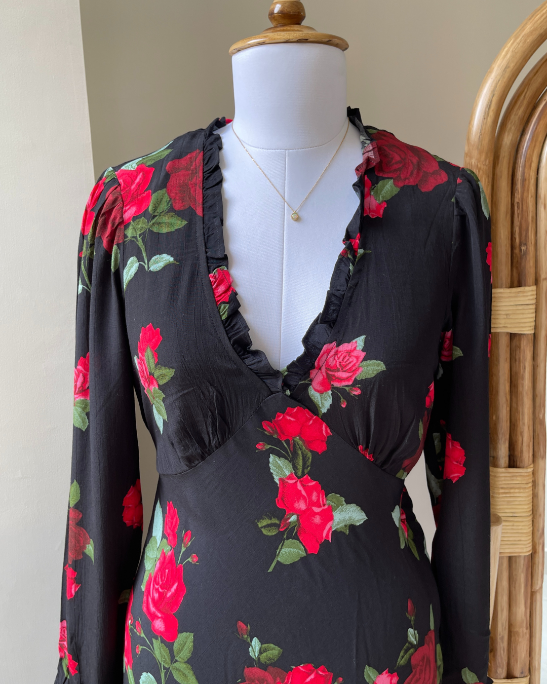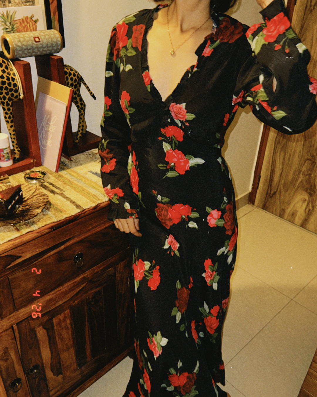 ✨ Details: Elegant maxi dress featuring a deep V-neckline, full-length sleeves, and an all-over rose print that creates a timeless, romantic silhouette with a fluid drape